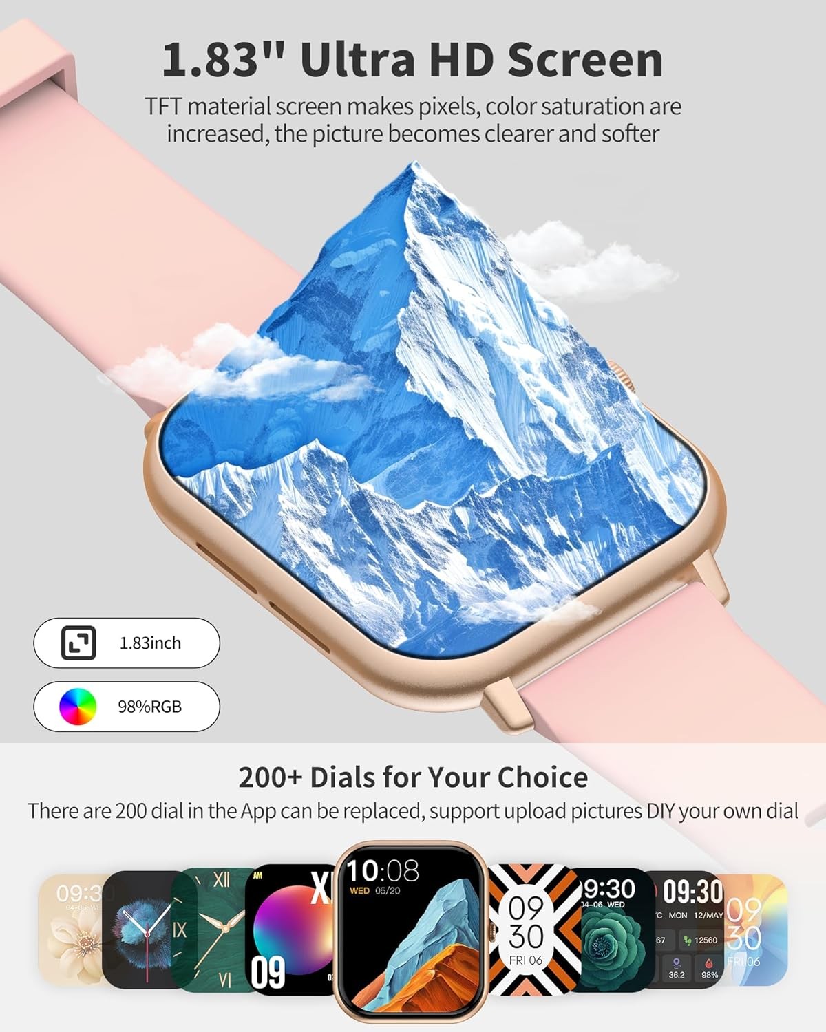 We have updated the TFT material of the screen to make the smart watch picture richer and clearer, and the brightness can also be adjusted. There are over 200 different watch faces available for download and use within the app